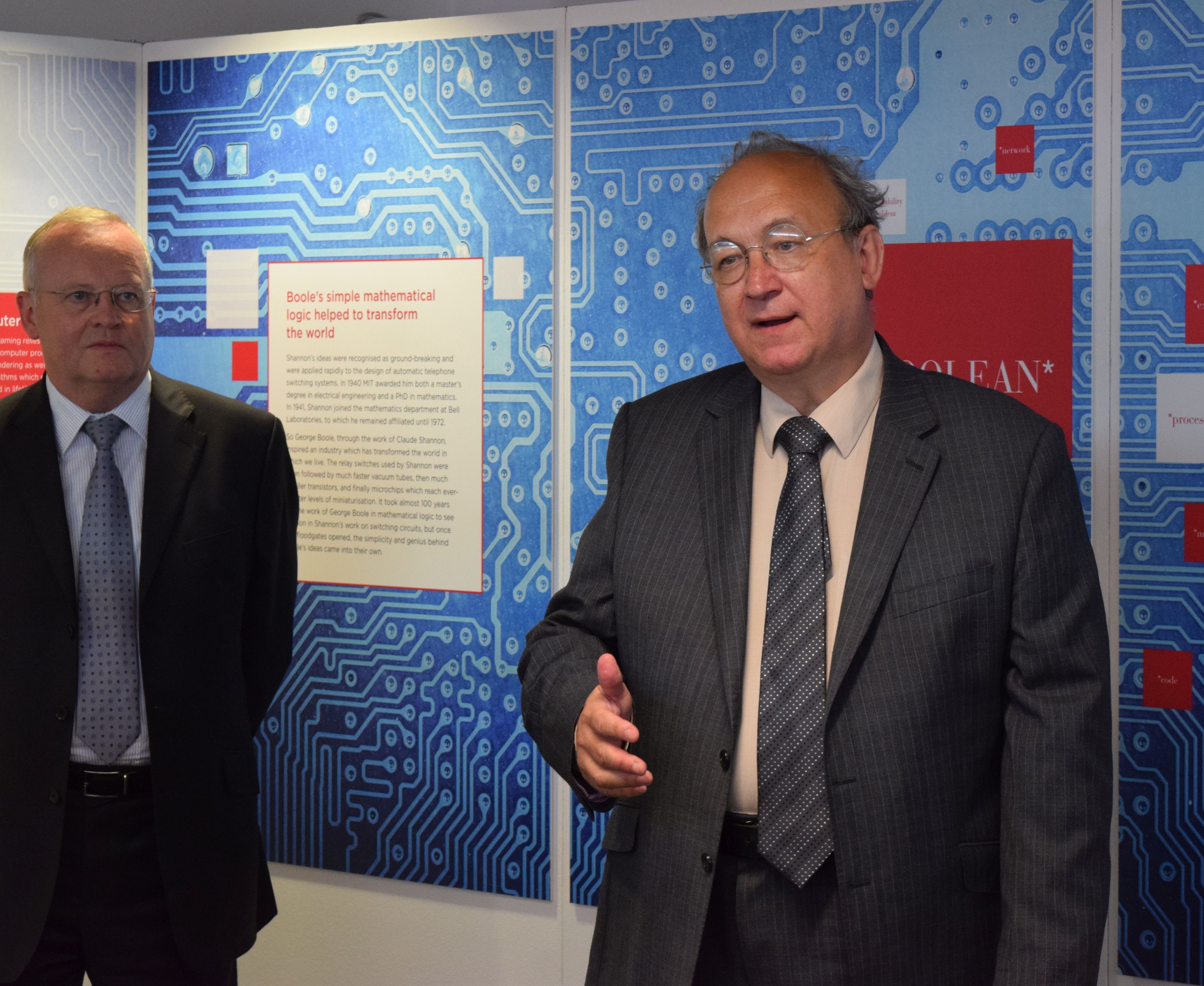 An exhibition celebrating the bicentenary of George Boole simultaneously opened in University of Lincoln http://library.lincoln.ac.uk/news/2015/07/06/george-boole-exhibition/ and in University College Cork, Ireland. The launch event in the University of Lincoln Library on 16 July was attended by Prof Alexandre Borovik, a trustee of the London Mathematical Society, which awarded a “Local Heroes” grant for support of the exhibition in University of Lincoln and Lincoln Cathedral. A short speech by Prof A. Borovik can be found here: http://education.lms.ac.uk/2015/07/george-booleglobal-hero/ . The exhibition was formally opened by Deputy Vice-Chancellor Prof Scott Davidson (who, by the way, mentioned how people in Law Dept., when using one of the first computerized databases in 1980s, had to learn Boolean “and”, “or”, “not” and bracket arrangements). The University Librarian Ian Snowley outlined the story behind the exhibition and thanked all the parties contributing to its success.