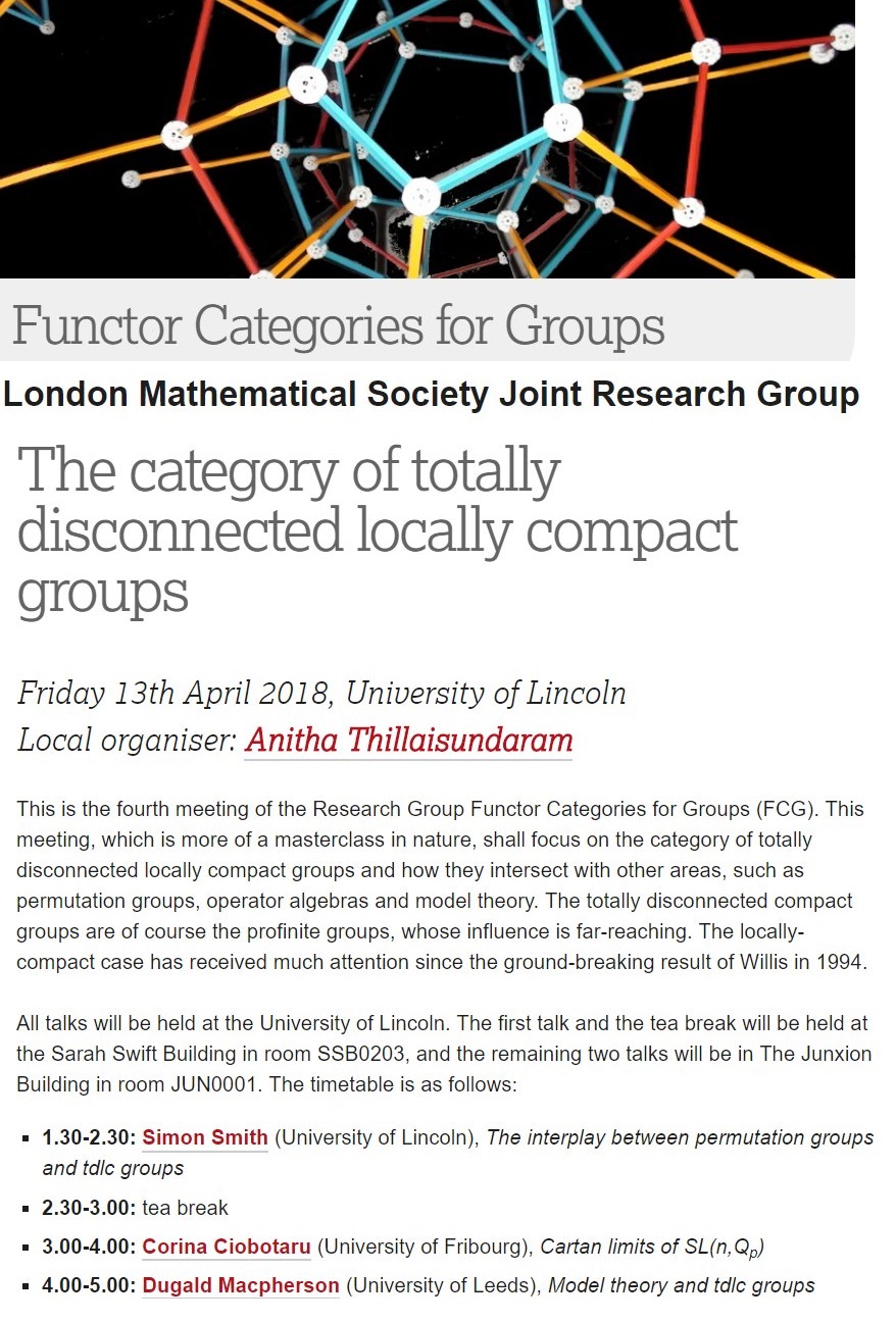 On Friday the 13th of April 2018 a one-day algebraic conference was conducted at the University of Lincoln “The category of totally disconnected locally compact groups“.  The conference was supported by a grant of the London Mathematical Society as part of the Joint Research Group on Functor Categories of Groups. Other meetings in this series will be at University of London Royal Holloway in September and at the University of Lancaster in December. The speakers in Lincoln included Simon Smith (Lincoln), Corina Ciobotaru (Fribourg, Switzerland) and Dugald Macpherson (Leeds). The talks attracted keen interest of the audience reflected in numerous questions and discussions, which continued during the coffee break and subsequent conference dinner.