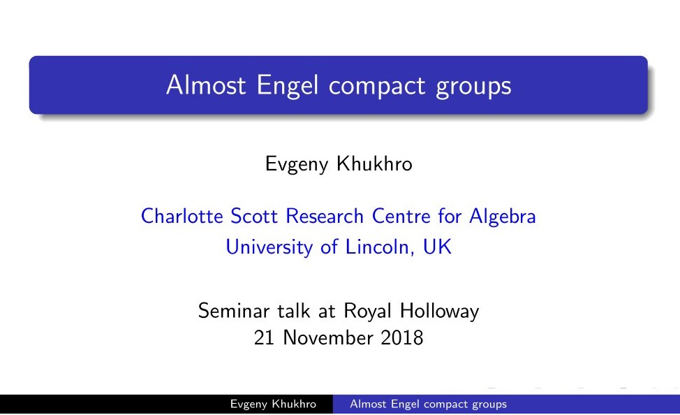On 21 November 2018 Evgeny Khukhro visited Royal Holloway, Univ. of London, and gave a talk at the Pure Mathematics Seminar “Almost Engel compact groups“.
