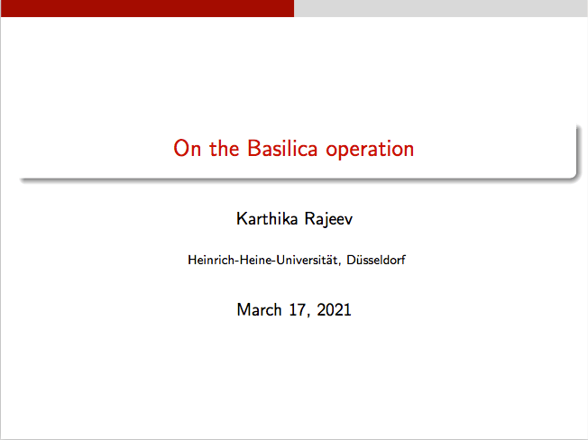 On Wednesday the 17th of March 2021, Karthika Rajeev (Heinrich-Heine-Universitaet) virtually visited the Charlotte Scott Centre for Algebra and gave a talk on her research on the Basilica operation.