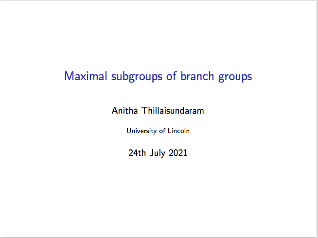 In July 2021, Anitha Thillaisundaram gave an online talk at the hybrid conference on Rings and Polynomials in Graz, Austria. She spoke on maximal subgroups of branch groups, and their relation to a conjecture of Kaplansky on group rings.