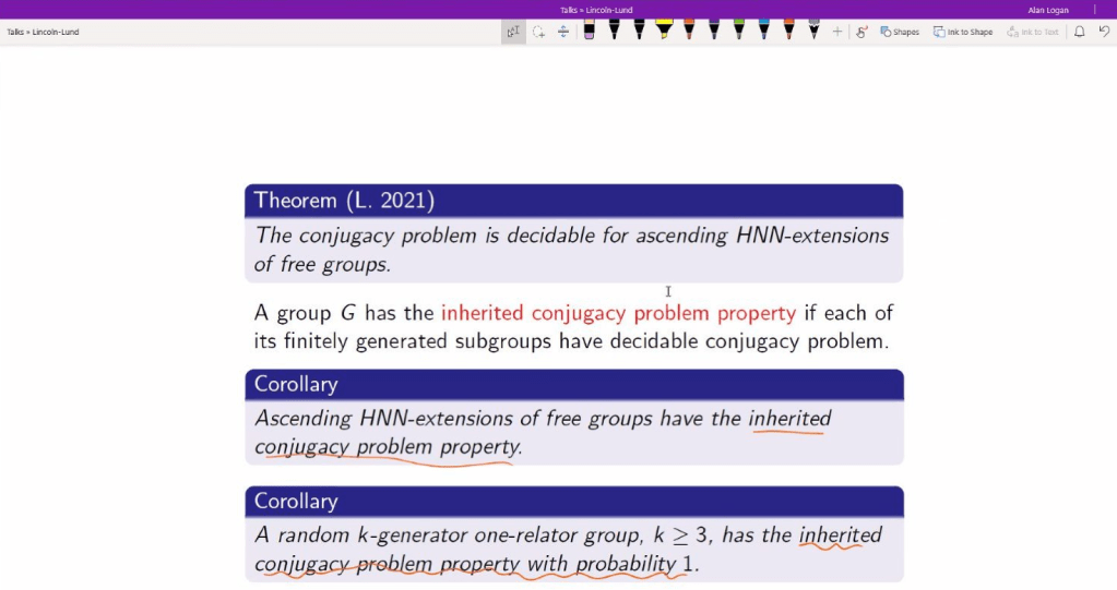 On Wednesday the 27th of October 2021, Alan Logan (Heriot-Watt University, Edinburgh) virtually visited the Charlotte Scott Centre for Algebra and Lund University, and he gave a talk on his research on the conjugacy problem for ascending HNN-extensions of free groups.