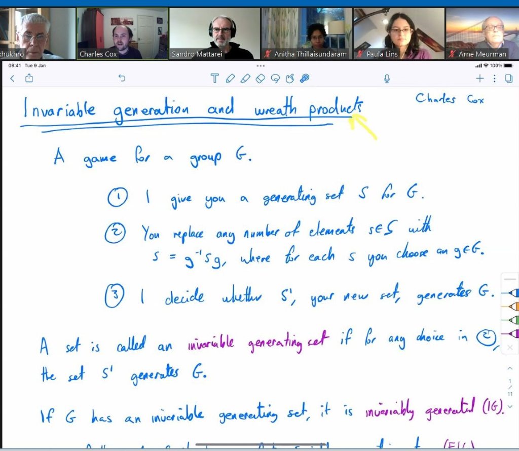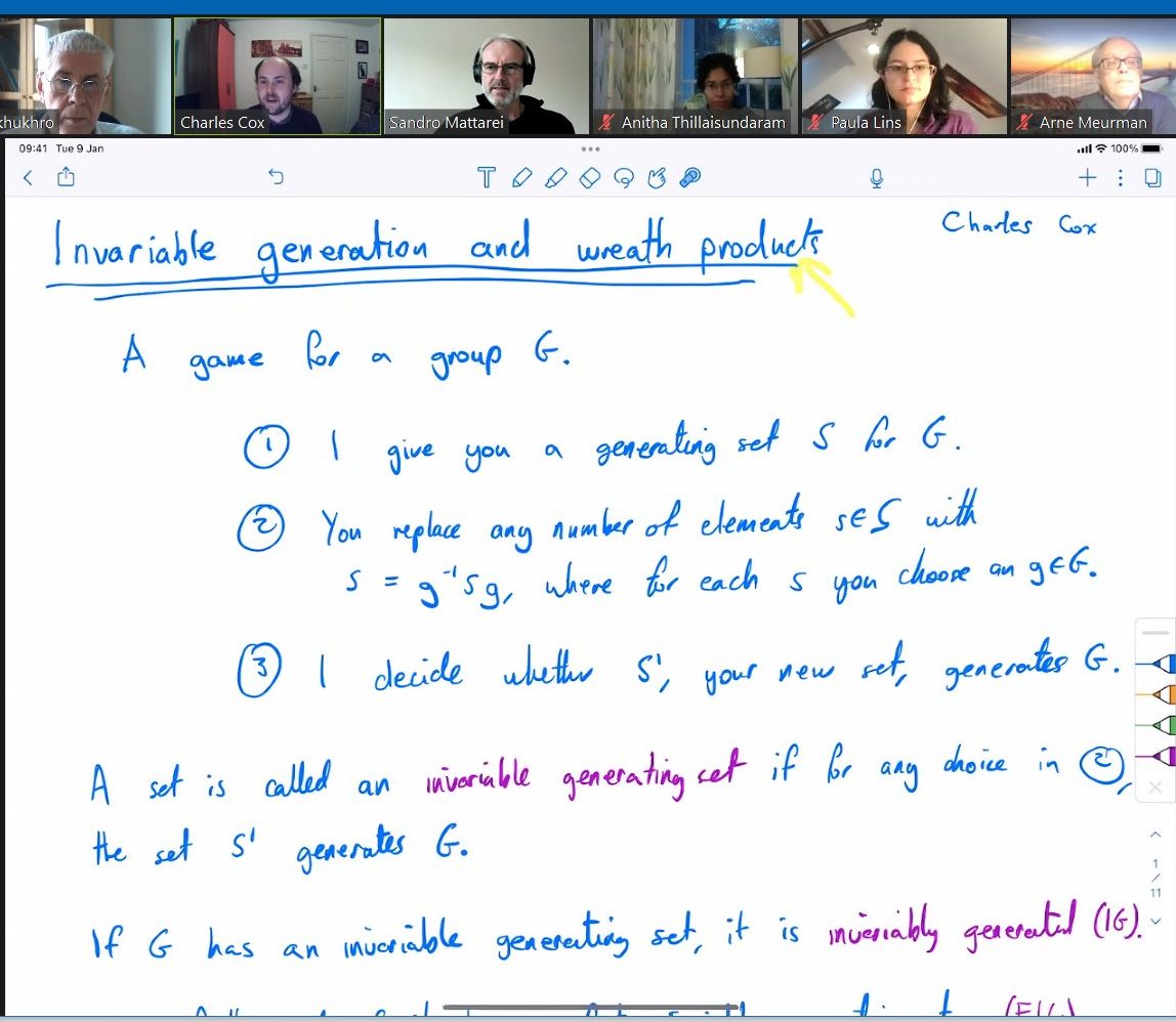 On Wednesday the 10th of November 2021, Charles Cox (University of Bristol) virtually visited the Charlotte Scott Centre for Algebra and Lund University, and he gave a talk on his research on invariable generation and wreath products.