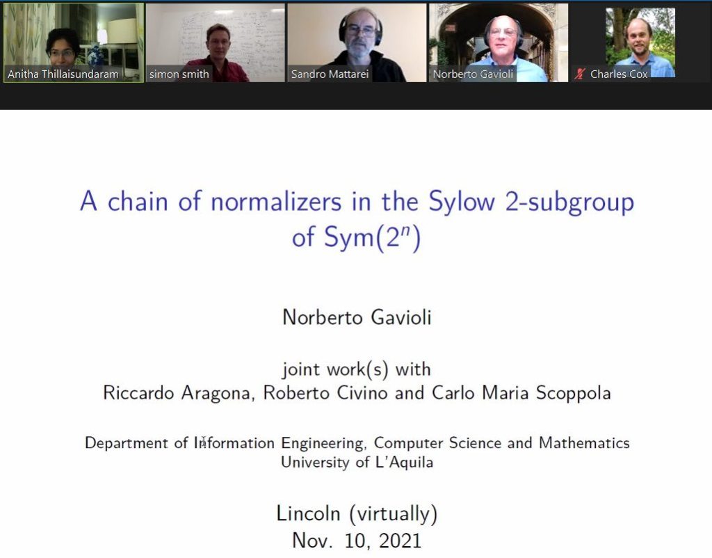 On Wednesday the 10th of November 2021, Norberto Gavioli (University of L’Aquila) virtually visited the Charlotte Scott Centre for Algebra and Lund University, and he gave a talk on his research on a chain of normalizers in the Sylow 2-subgroup of Sym(2^n).