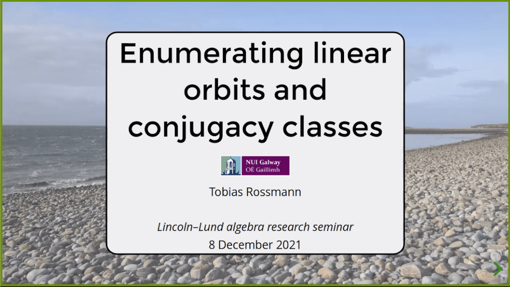 On Wednesday the 8th of December 2021, Tobias Rossmann (National University of Ireland, Galway) virtually visited the Charlotte Scott Centre for Algebra and Lund University, and he gave a talk on his research on enumerating linear orbits and conjugacy classes.