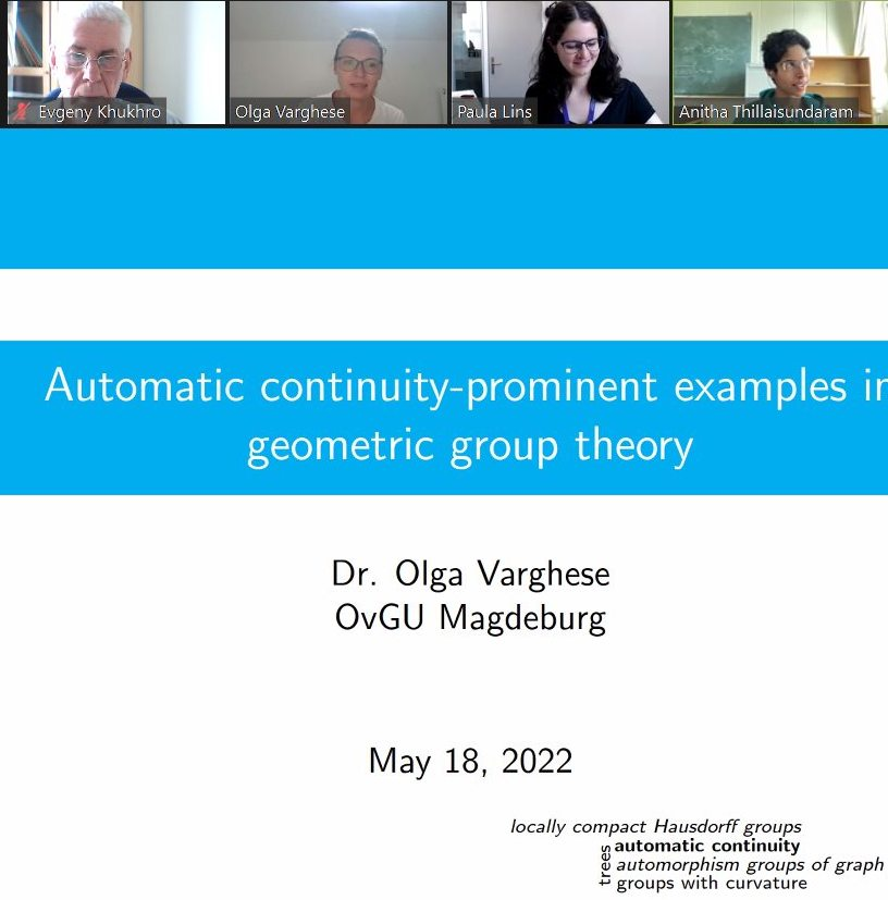 On Wednesday the 18th of May 2022, Olga Varghese (Otto von Guericke University Magdeburg) virtually visited the Charlotte Scott Centre for Algebra in Lincoln and Lund University and gave a talk “Automatic continuity-prominent examples in geometric group theory”.