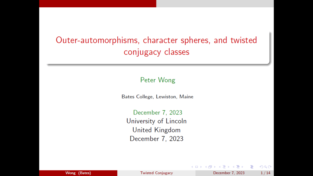 Talk title: Outer Automorphisms, Character Spheres, and Twisted Conjugacy