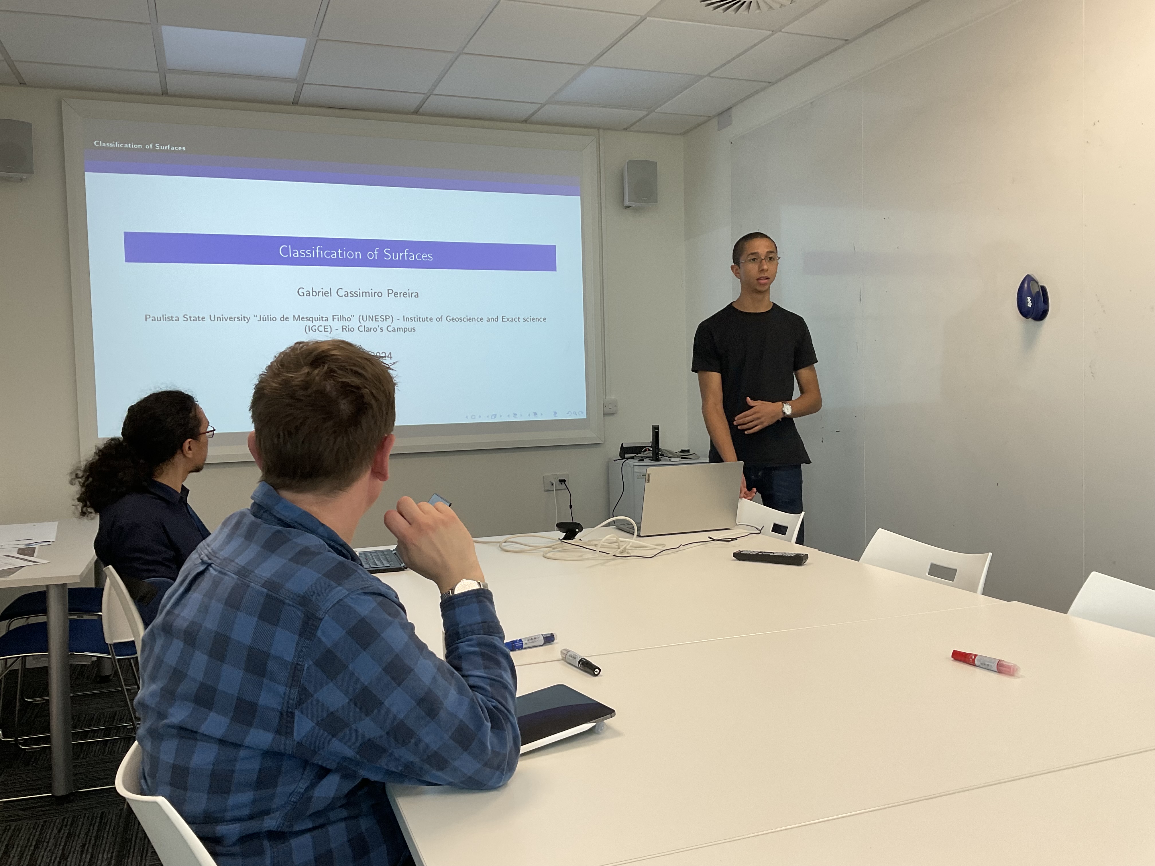 On this Wednesday, 8th of May 2024, Gabriel Cassimiro Pereira (São Paulo State University) has given a talk at the Charlotte Scott Centre at Lincoln during his visit. He spoke about the undergraduate research he has done in Brazil. The talk was entitled Classification of surfaces.